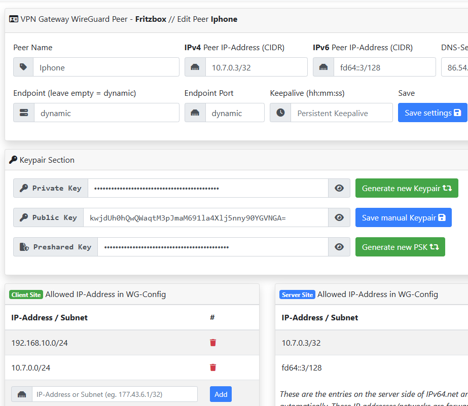 Ich hatte bereits eine funktionierende VPN Wireguard Verbindung auf dem Eierföner. Das einzige, was nicht geht, ist eine ipv4 Vebindung aus dem Ausland wegen DS lite. Die VPN Verbindung aus dem ipv6 Netzwerk läuft einwandfrei. Also kein Problem prinziiell mit dem iPhone. Diese gerätespezifischen Verbindungen musste ich in der fritzbox löschen, damit die neue wireguard.conf akzeptiert wird. Daher vermute ich ein Problem mit einer Einstellung in meiner fritzbox. (Routing, DNS, was weiß ich …) Wenn mein Screenshot stimmt, ist die fritzbox korrekt verbunden mit dem cloud router. Aber es passt etwas mit dem Client /Peer nicht. Vielleicht hat ja noch jemand eine Idee.