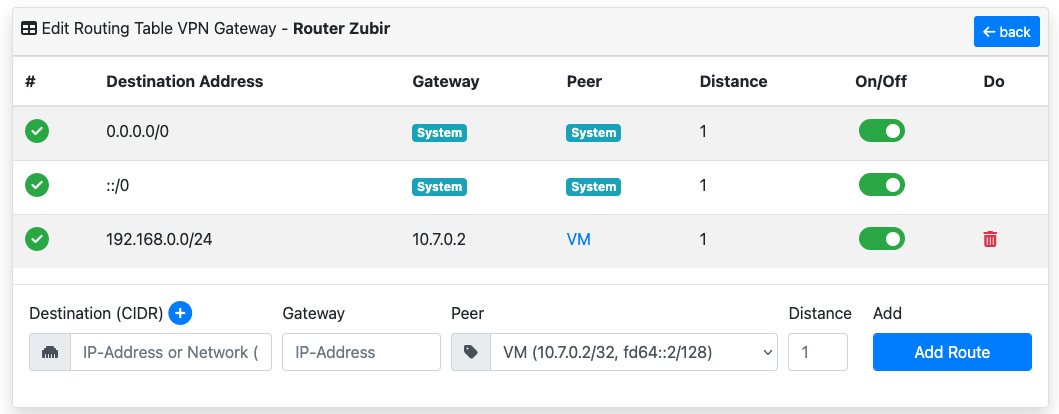 Das Routing im Cloud Router ist entsprechend meiner davor liegenden Fritzbox und deren Netz auf 192.168.0.0/24 gesetzt.