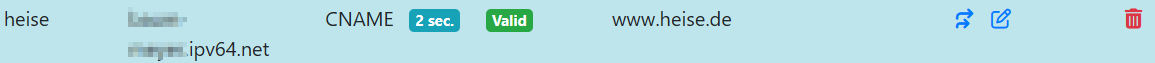 Dann kann ich die Domain anklicken und einen CNAME-Eintrag z.B. mit Prafix “bla” und irgendeinem Ziel hinzufügen und danach über bla.abc.ipv64.de das Ziel auch erreichen.