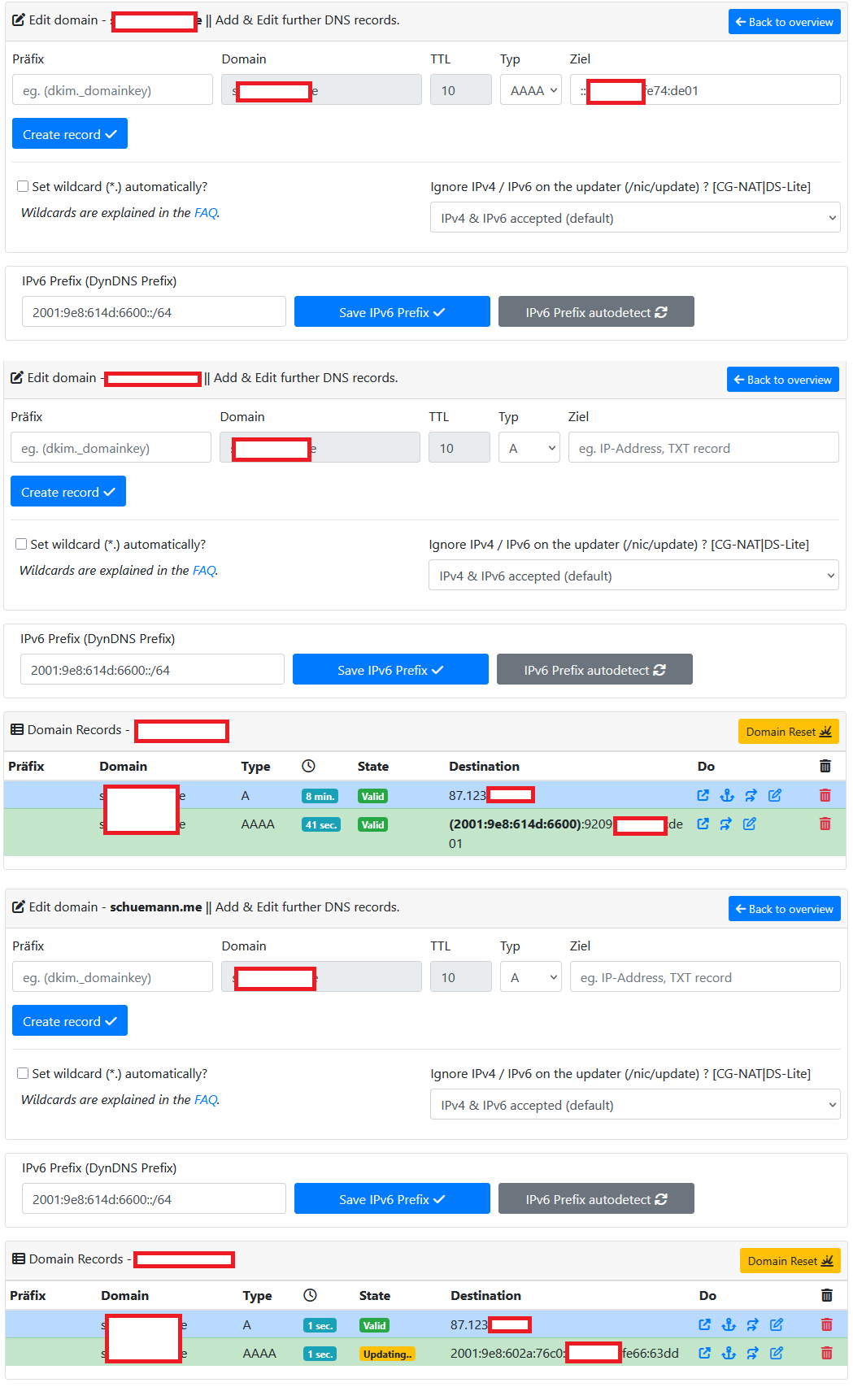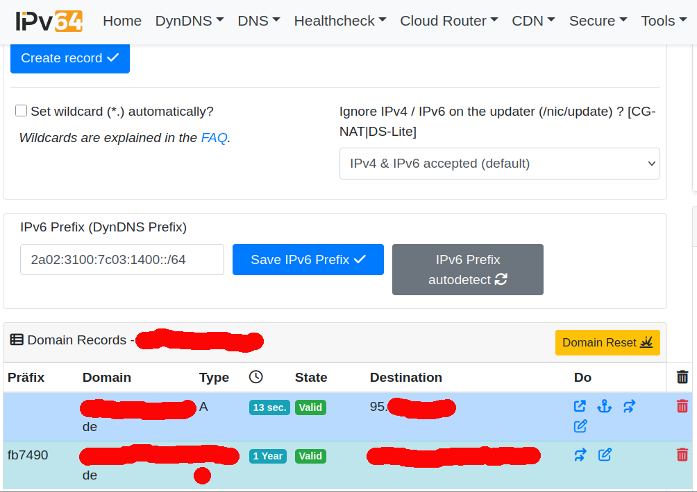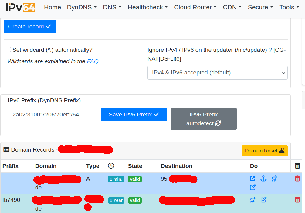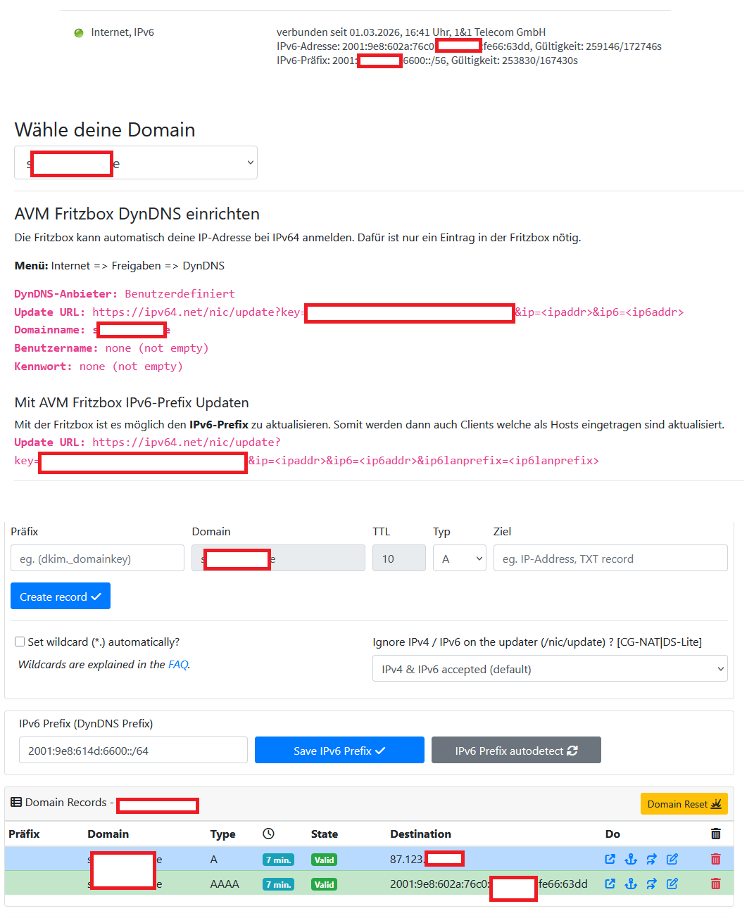 Es geht nur um IPv6. Hier habt ihr die Daten aus der Fritte. Nehme ich jetzt von Anleitungs-Seite die Update-URL für ‘Mit AVM Fritzbox IPv6-Prefixe Updaten’ werden meine Records wie folgt geschrieben: