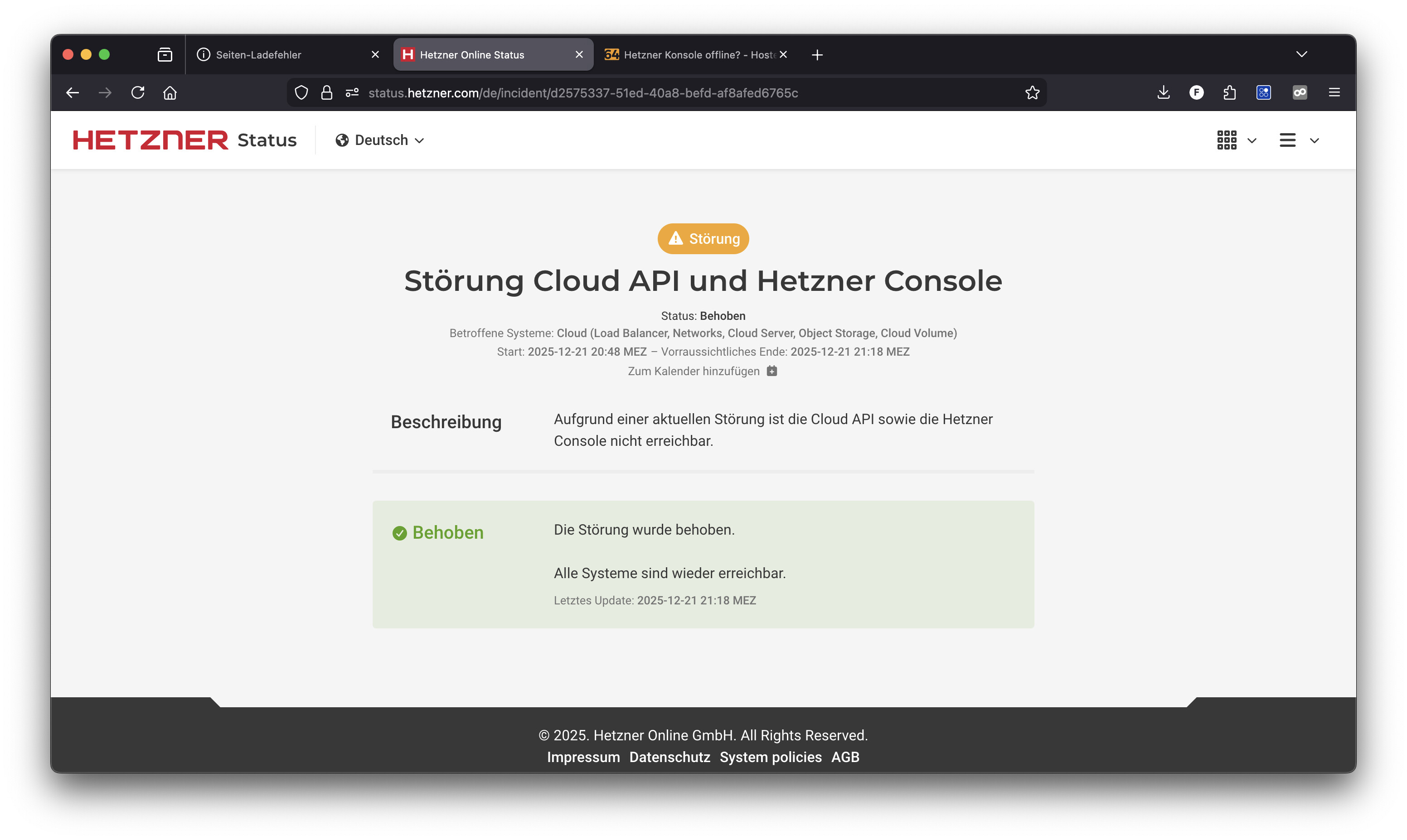 Laut der Hetzner-Statusseite soll das Problem allerdings bereits behoben sein.