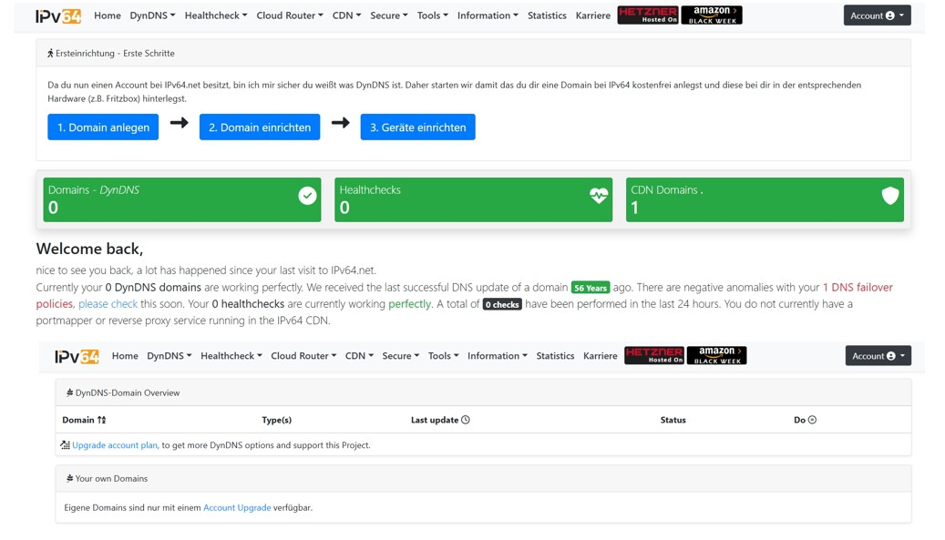 Ich kann leider keine DynDNS mehr anlagen. Habe noch keine Domain erstellt. Kann ja bis zu 3. Die Option wird mir nicht angeboten