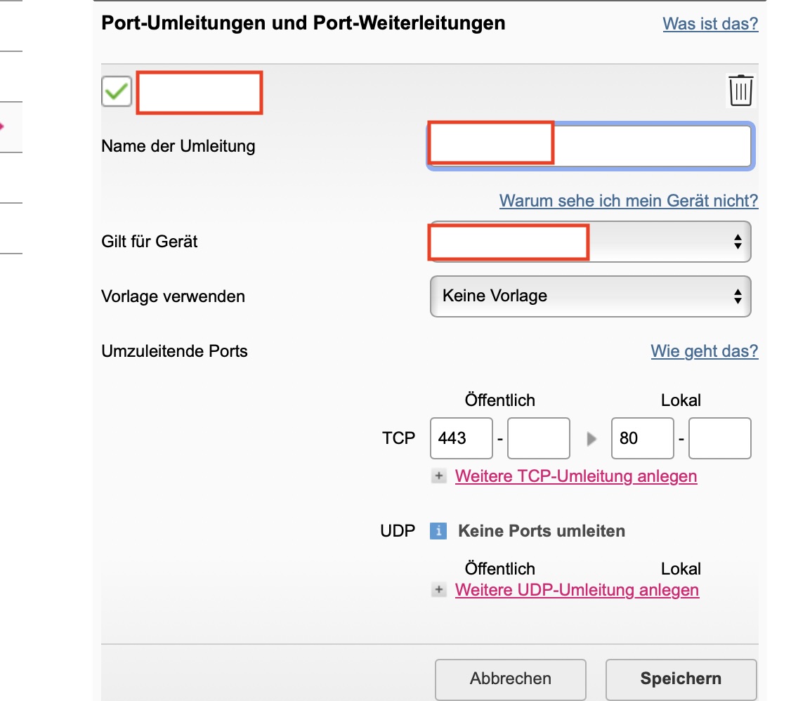 Danach gab es den Tip dass ich auf meinem Speedport Smart4 Router eine Portweiterleitung/Portumleitung einrichten muss, was ich gemacht habe. Öffentlich 443 auf lokal 443. Damit konnte ich mit der Adresse https:…… wiederum nicht zugreifen, das öffnen der Seite ist fehlgeschlagen.
