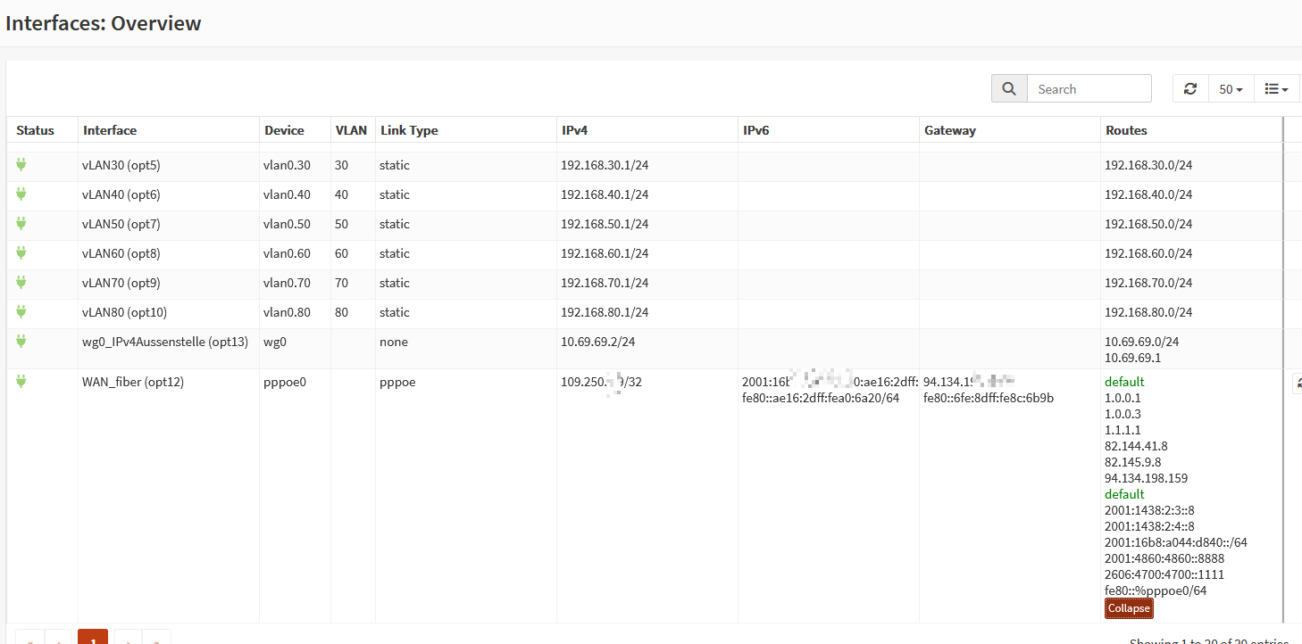 Im übrigen hast du dein IPv6 noch immer nicht vollständig konfiguriert. Deine zahlreichen VLAN’s haben ja noch kein v6. In der Abbildung oben sieht da ja jetzt nur was fürs WAN in der Spalte IPv6. Da gibt es noch einiges zu tun, bis alle rund läuft. Aber darauf geht die oben verlinkte Anleitung „IPv6 for generic DSL dialup“ nicht weiter ein.