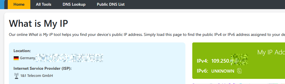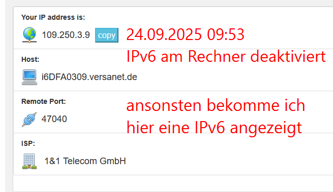 Und noch viel wichtiger … nix da mit lokaler IPv4. Die 94.134.###.## ist das Gateway. Lokal ist nur die 109.250.###.### vom CGNAT. Dual Stack ist aber trotzdem am Start. Zumindest laut schriftlicher Bestätigung von 1&1. Aber wie nur?!