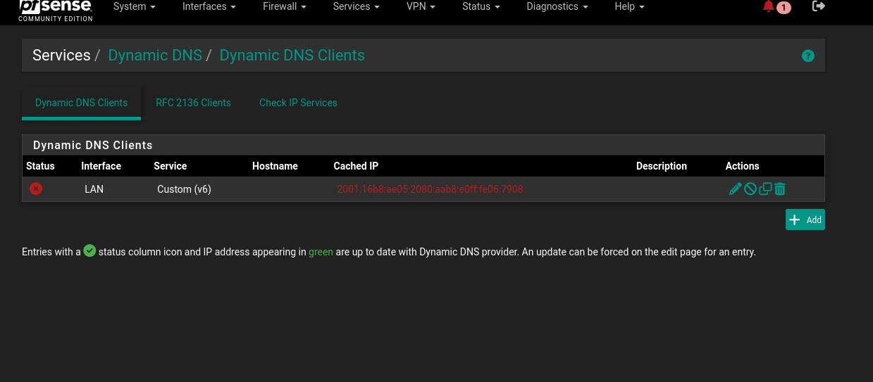 das war die IPv6 bevor ich die FB sich neu verbinden hatte lassen. Quasi der alte IPv6 Präfix, der nach der neuen Verbindung der FB an die Pfsense übergeben wurde und der vom DynDNS updater eigentlich aktualisiert werden sollte.