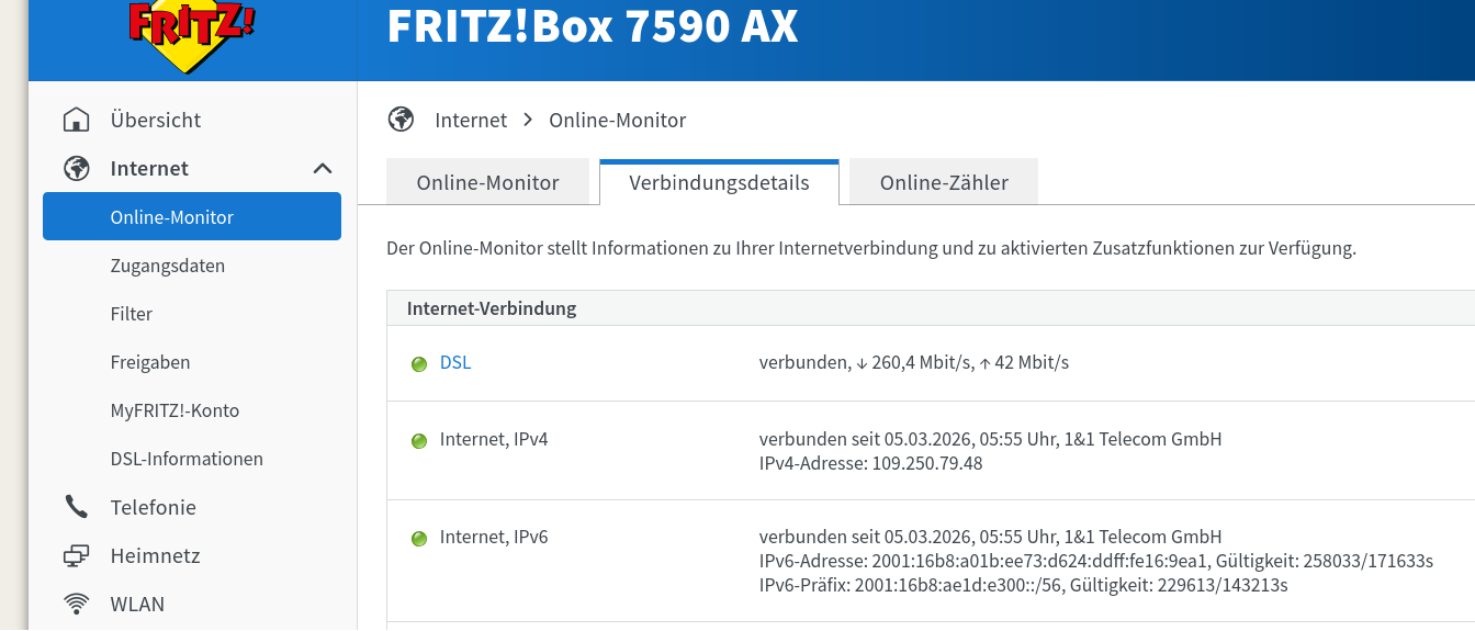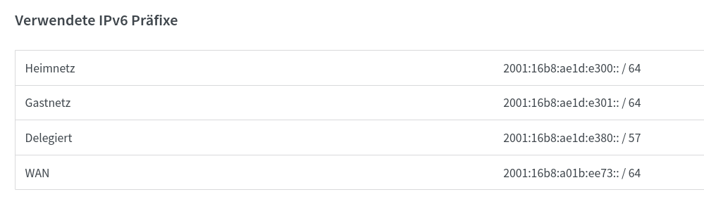 Was du da nun wieder herumgefummelt und verstellt hast, dass nun die ganze LAN-IPv6-Adresse aktualisiert wurde und grün ist, der LAN-IPv6-Präfix aber N/A erschließt sich mir nicht. Du solltest aber genau das Gegenteil machen. Also den Präfix da aktualisieren und die LAN-IPv6-Adresse nicht.
