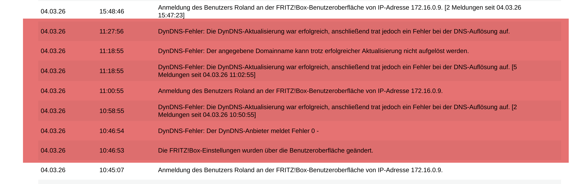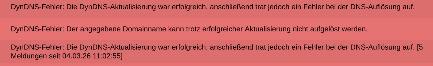 Da steht: Die DynDNS-Aktualisierung war erfolgreich, anschließend trat jedoch ein Fehler bei der DNS-Auflösung auf. zudem steht dort auch noch Der angegebene Domainname kann trotz erfogreicher Aktualisierung nicht aufgelöst werden