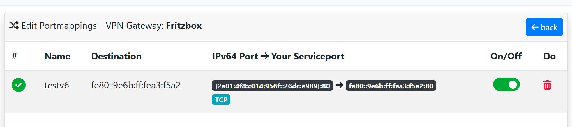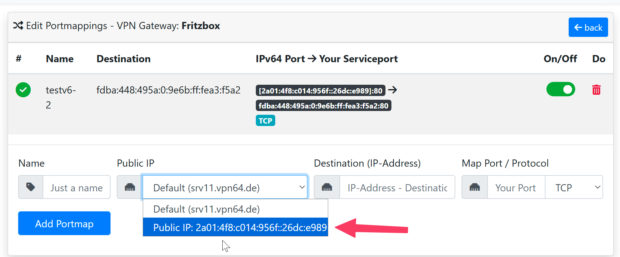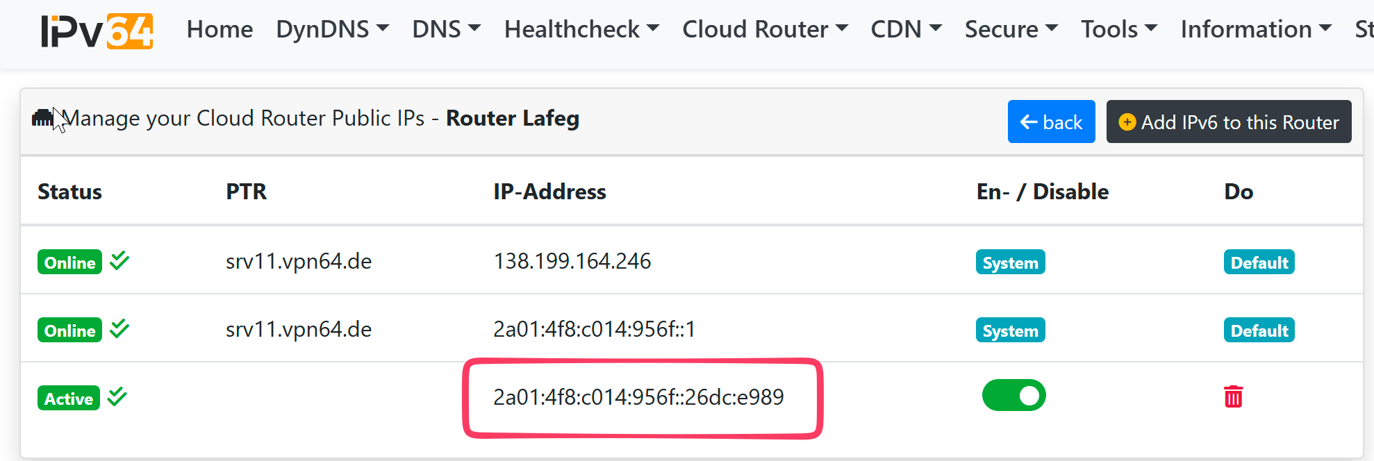 Unter „Manage Public IPs“ habe ich mir eine IPv6-Adresse erstellt und diese dann im Portmapper des Cloud Routers ausgewählt. Als Ziel habe ich testweise eine interne IPv6-Adresse von einem Webdienst bei mir im Netzwerk angegeben.