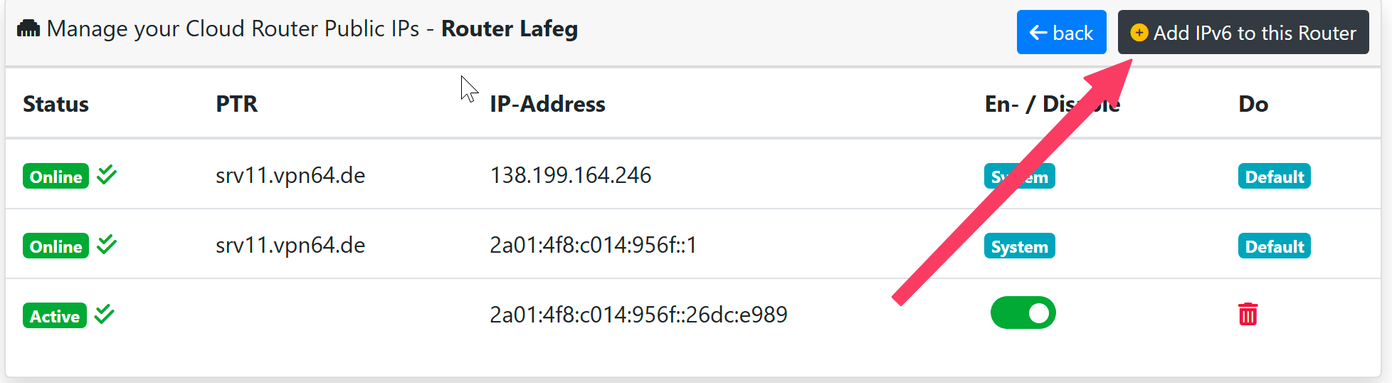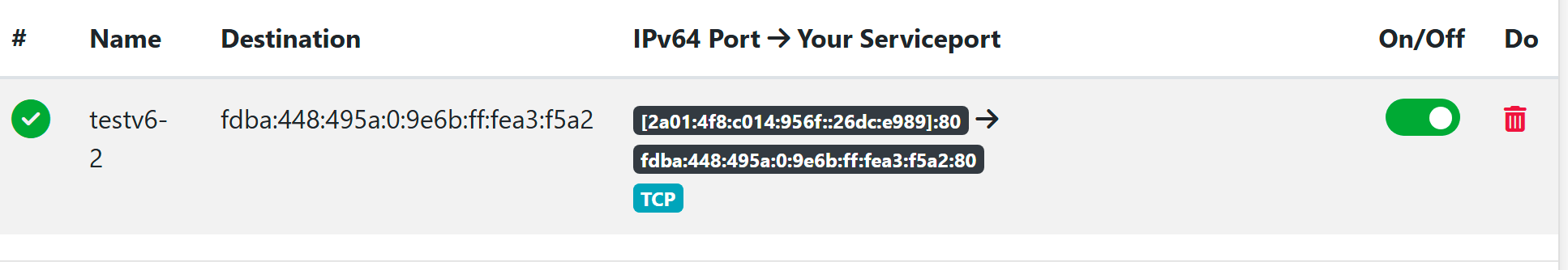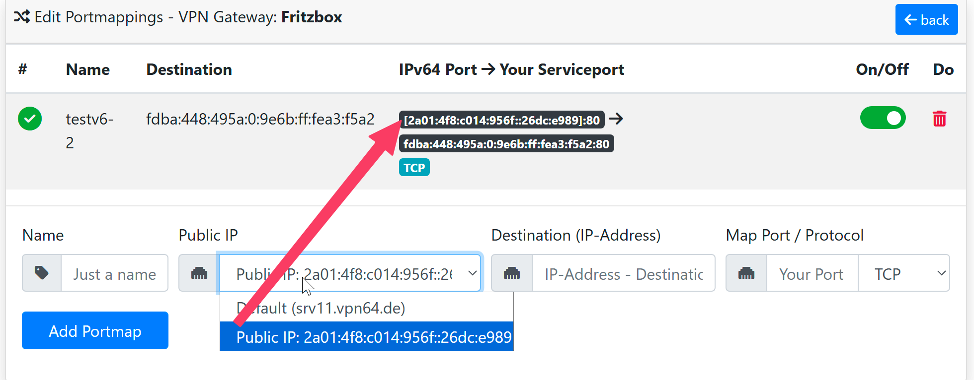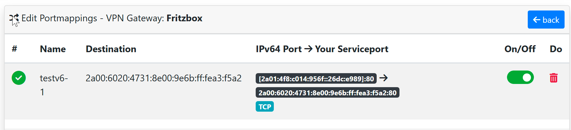 Unter „Manage Public IPs“ habe ich mir eine IPv6-Adresse erstellt und diese dann im Portmapper des Cloud Routers ausgewählt. Als Ziel habe ich testweise eine interne IPv6-Adresse von einem Webdienst bei mir im Netzwerk angegeben.
