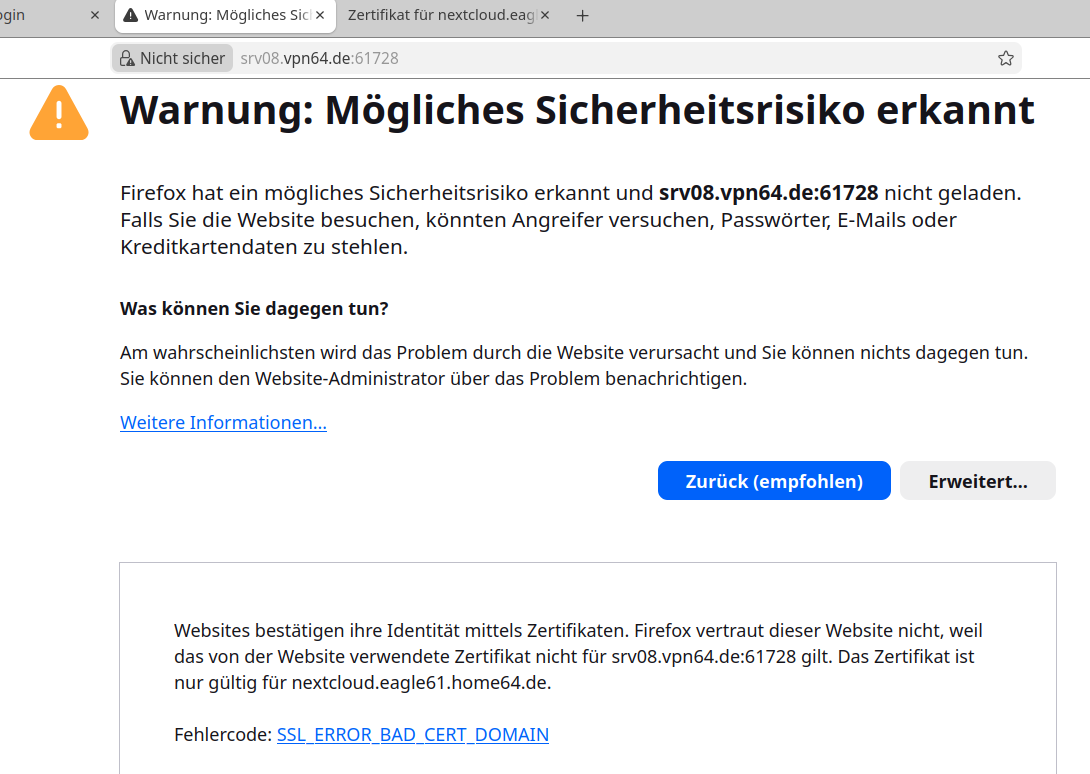 Rufe ich nun aus dem Mobilfunknetz die Adresse https://srv08.vpn64.de:61728 lande ich in der zu erwartenden Sicherheitswarnung des FF. Die Domain passt nun ja nicht zum Let’s Encrypt Zertifikat. Siehe: