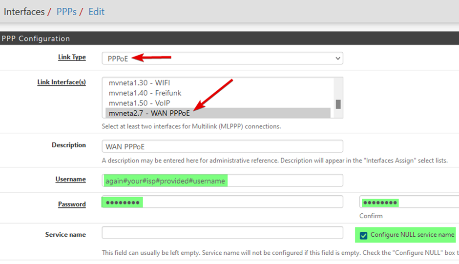 So kannst du sicher sein, dass du alle notwendigen Infos zur PPPoE Konfiguration der pfsense, wie Username & Password korrekt vorliegen hast.