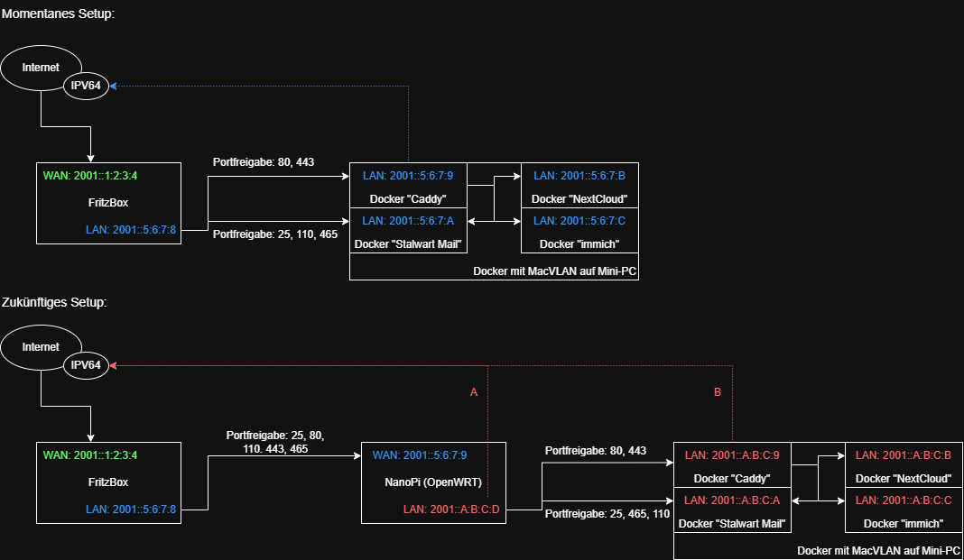 Instinktiv hätte ich das nun mit dem neuen Setup auch so gemacht, auch wenn der Docker mit Caddy nun eine IPv6 mit Präfix von OpenWRT bekommt (Pfad B in meinem Bild unten). Jetzt lese ich aber, dass ich in meinem neuen Setup nicht mehr die IPv6 des Docker-Containers an meinen DynDNS-Anbieter übergeben soll, sondern die IPv6 die OpenWRT sich selbst im eigenen LAN zuteilt (Pfad A in meinem Bild unten).