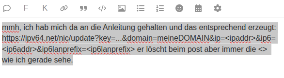 Korrekt sieht das in allen Fritten so aus https://...64.de&ip=<ipaddr>&ip6=<ip6addr>&ip6lanprefix=<ip6lanprefix>