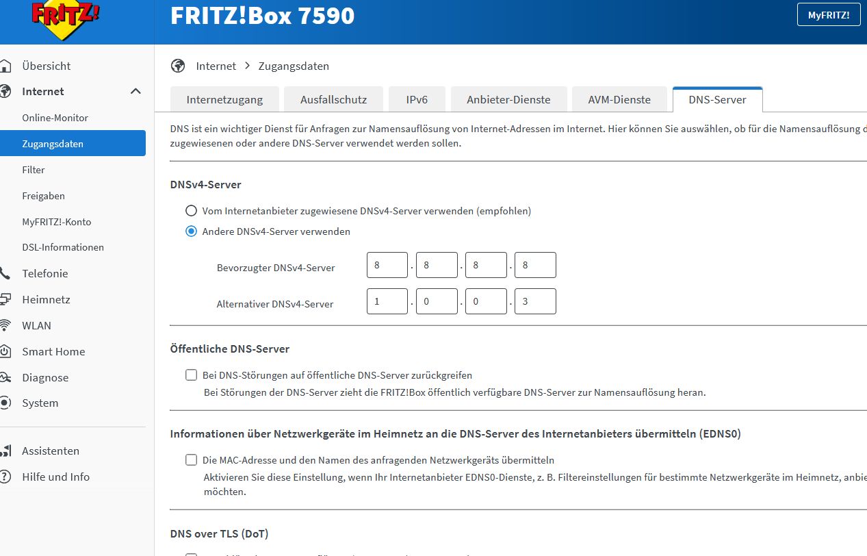 Also ändere mal die DNS-Server die deine Fritte befragt. Dann wissen wir ob die automatisch von 1und1 zugewiesenen ipv64,net gerade blockieren.