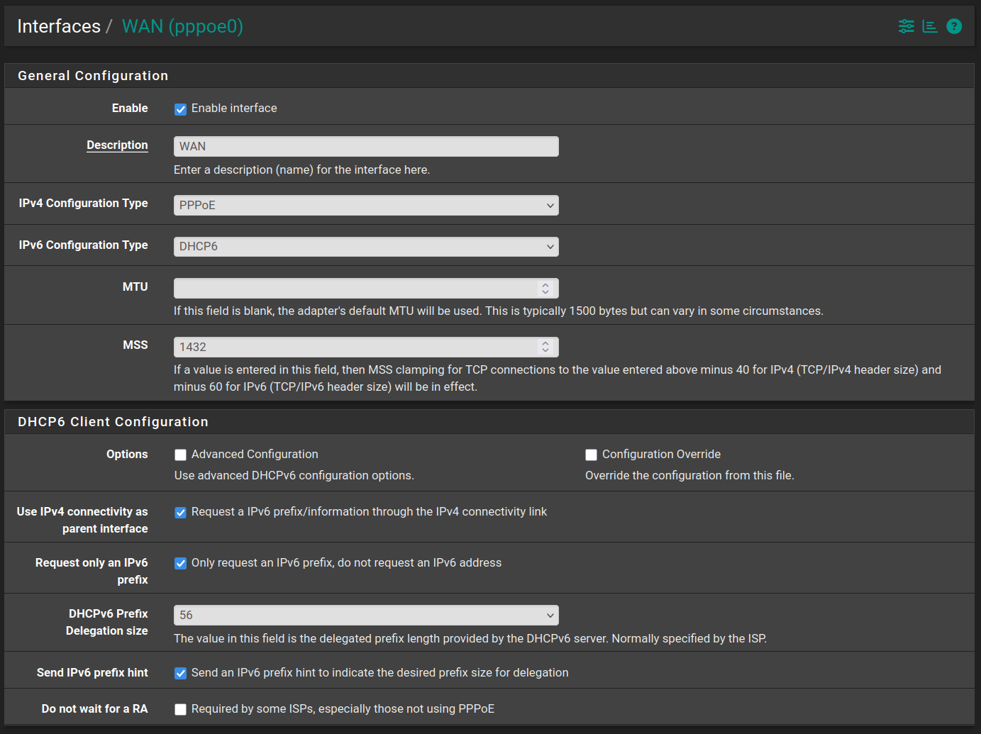 Bei mir in der pfsende verschwinden dann unter DHCP6 Client Configuration auch alle Optionen zur Anforderung und Delegation von Ipv6-Präfixen, wenn ich am WAN von DCHP zu SLAAC wechsle. Macht bei SLAAC eben keinen SInn, weil geht dann nicht