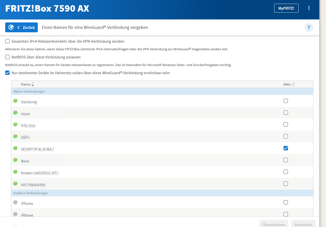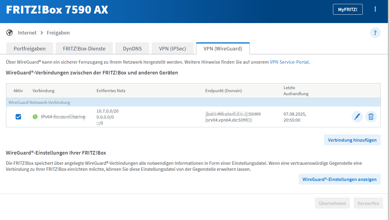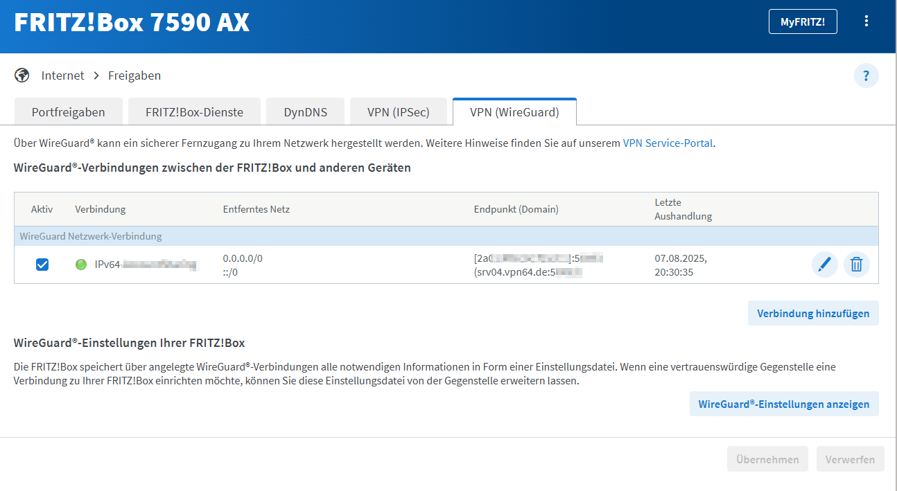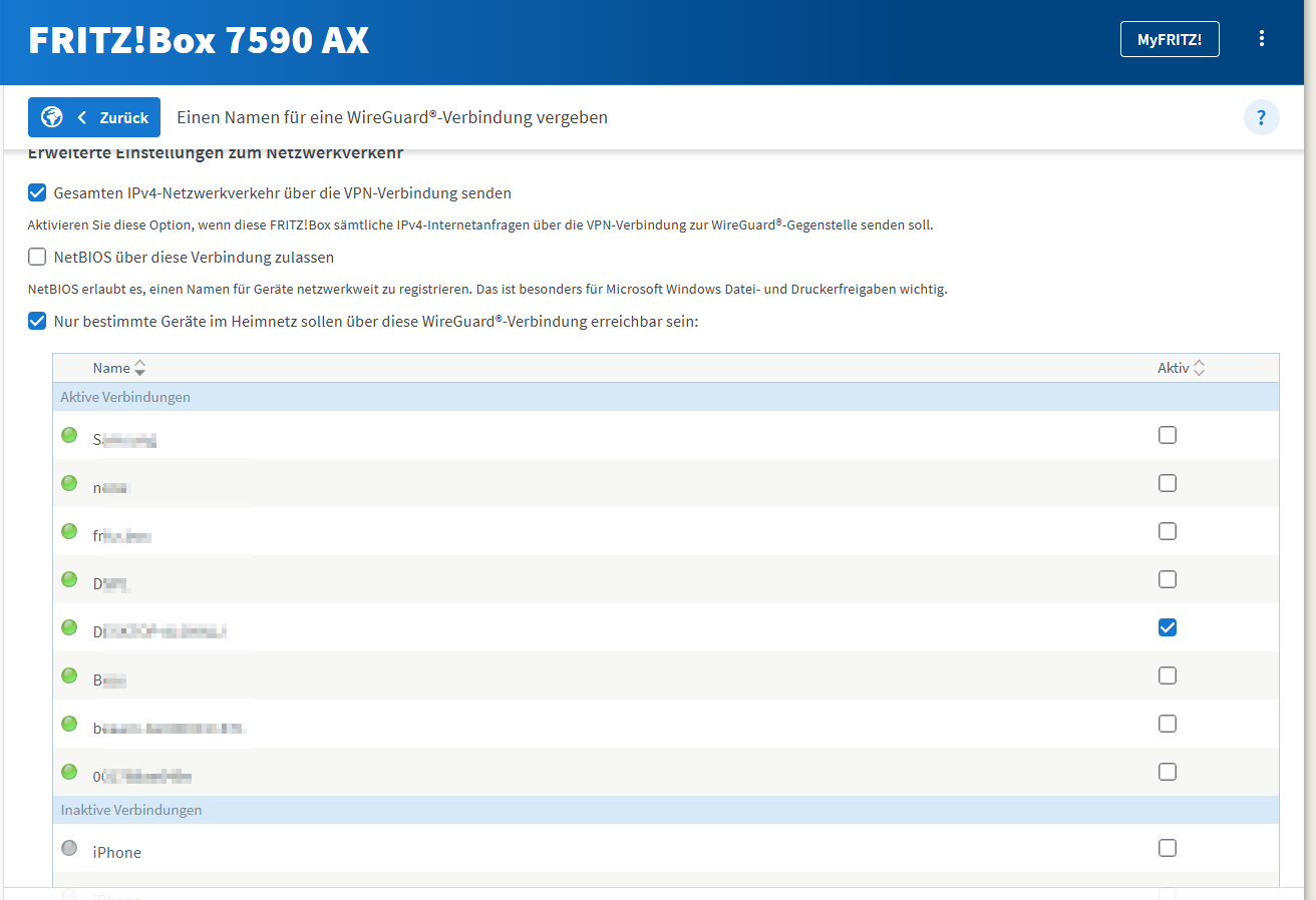 Die Funktion “Gesamten IPv4-Netzwerkverkehr über die VPN-Verbindung senden“ wird nicht verwendet, weil die Fritzbox sonst wirklich den gesamten Netzwerkverkehr aller angeschlossenen Geräte durch den WireGuard-Tunnel schickt.