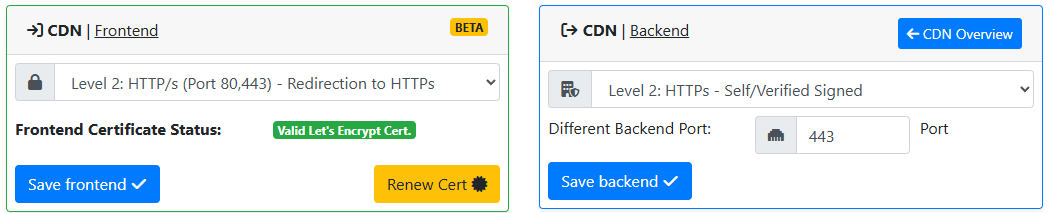 Der Traefik läuft auf einem Proxmox-LXC und stellt aktuell den eigenen whoami-Service bereit. Lokal funktioniert das ebenfalls. In der Fritzbox sind die Portfreigaben 80/443 für den LXC sowohl für IPv4 und v6 eingetragen (IPv4 wird wieder entfernt sobald alles funktioniert). Ich habe jetzt in meinem CDN den ReverseProxy aktiviert und das Backend unsecure auf 80 weitergeleitet. Nach meinem Verständnis ist das Backend meine Fritzbox. Das CDN-Frontend stellt ein Zertifikat bereit und hört auf 80/443. Somit sollten Anfragen auf meine DynDNS-Domain doch bei meinem Traefik ankommen, oder?