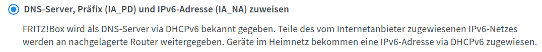 Nur dann kannst du sicherstellen, dass das QNAP immer eine IPv6-Adresse mit festem Interface Identifier von deiner Fritte zugewiesen bekommt. Der Network Prefix ist ja stets dynamisch und wird vom ISP nach jeder Zwangstrennung neu zugewiesen. Damit die Fritte das macht, muss in der Fritte IA_PD und IA_NA aktiviert werden.