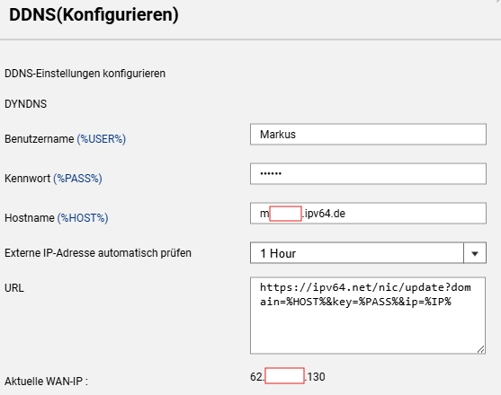 Wenn das gegeben ist, kann die Fritte bei IPv64 den IPv6-Prefix updaten und du kannst für das NAS bei ipv64 einen AAAA-Record im Format „Interface-ID“ oder „EUI-64 MAC“ anlegen.